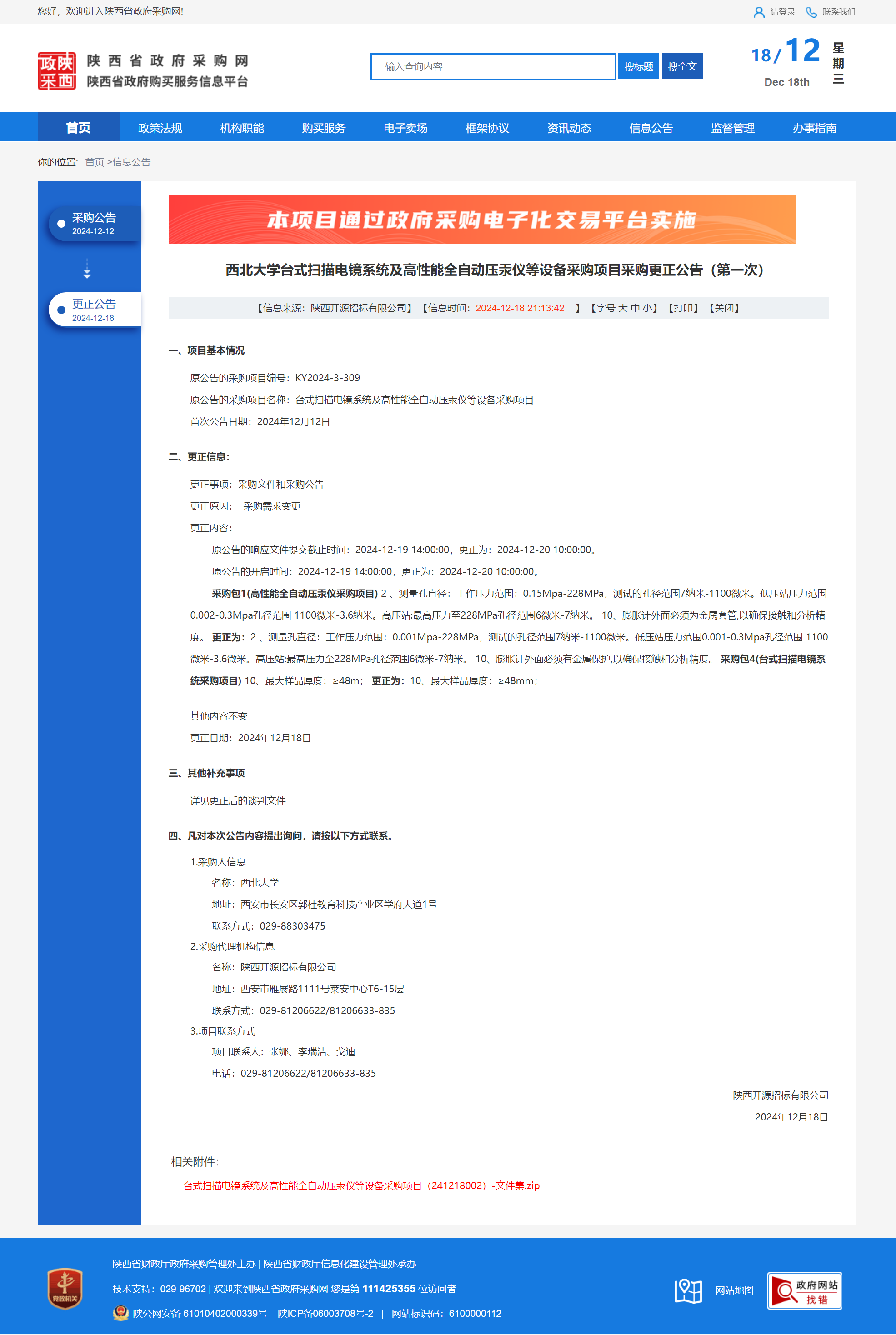 西北大学台式扫描电镜系统及高性能全自动压汞仪等设备采购项目采购更正公告(第一次)