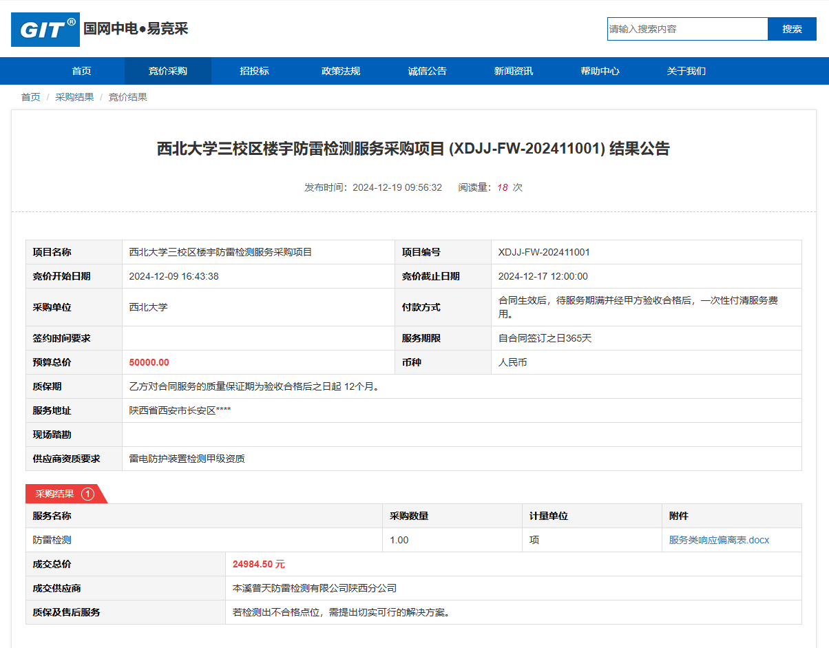 西北大学三校区楼宇防雷检测服务采购项目(XDJJ-FW-202411001)竞价结果公告 作者:采购与招标办公室 编辑: 时间:2024-12-19 原公告链接:https://www.ejingcai.com.cn/site/bidding/detail/16077