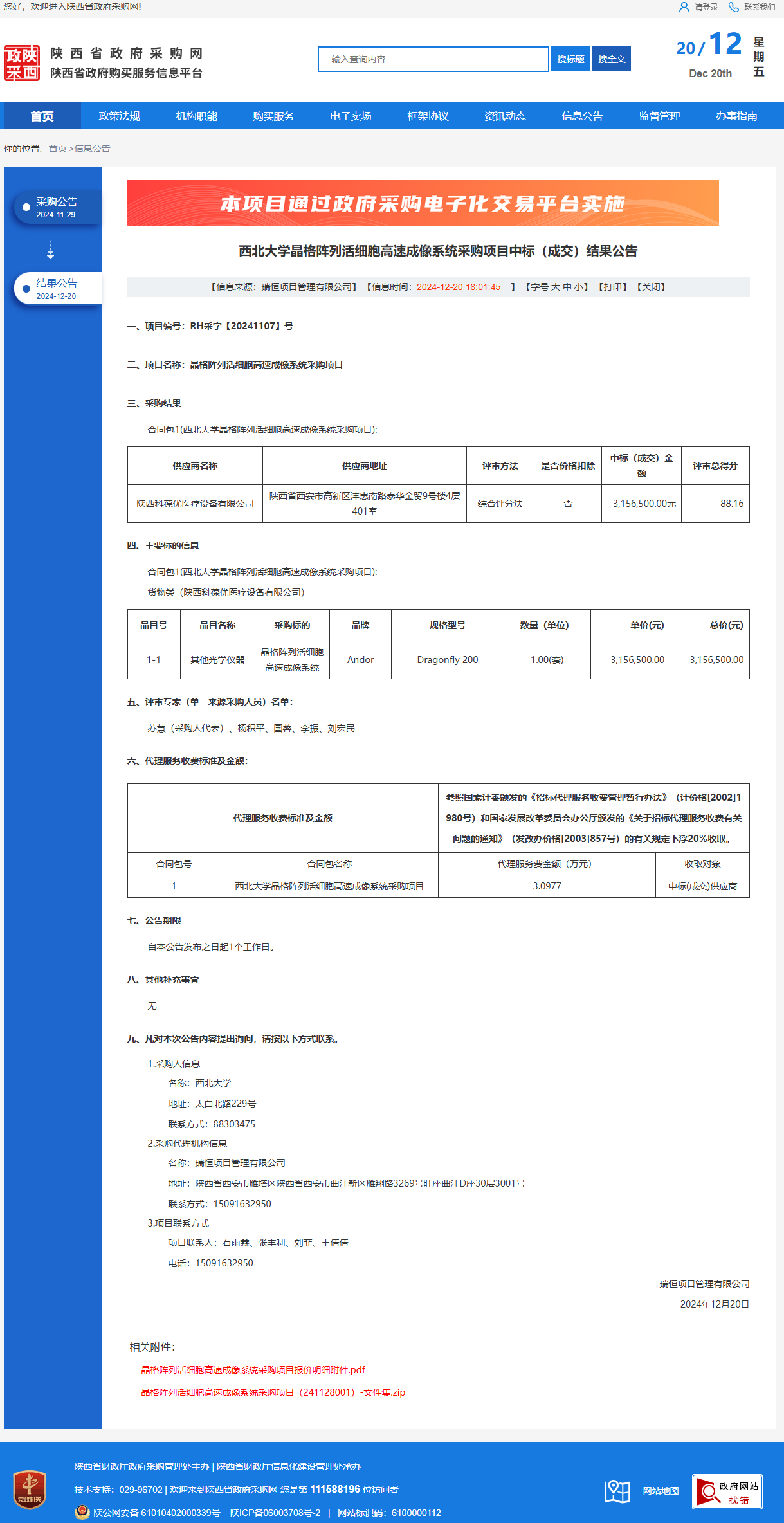 西北大学晶格阵列活细胞高速成像系统采购项目中标(成交)结果公告 作者:采购与招标办公室 编辑: 时间:2024-12-20 原公告链接:https://www.ccgp-shaanxi.gov.cn/freecms/site/shaanxi/ggxx/info/2024/8a69c95d921859f00193e29f761501c8.html?noticeType=001021¬iceId=0e797da5-bebb-11ef-8063-08c0eb20c666