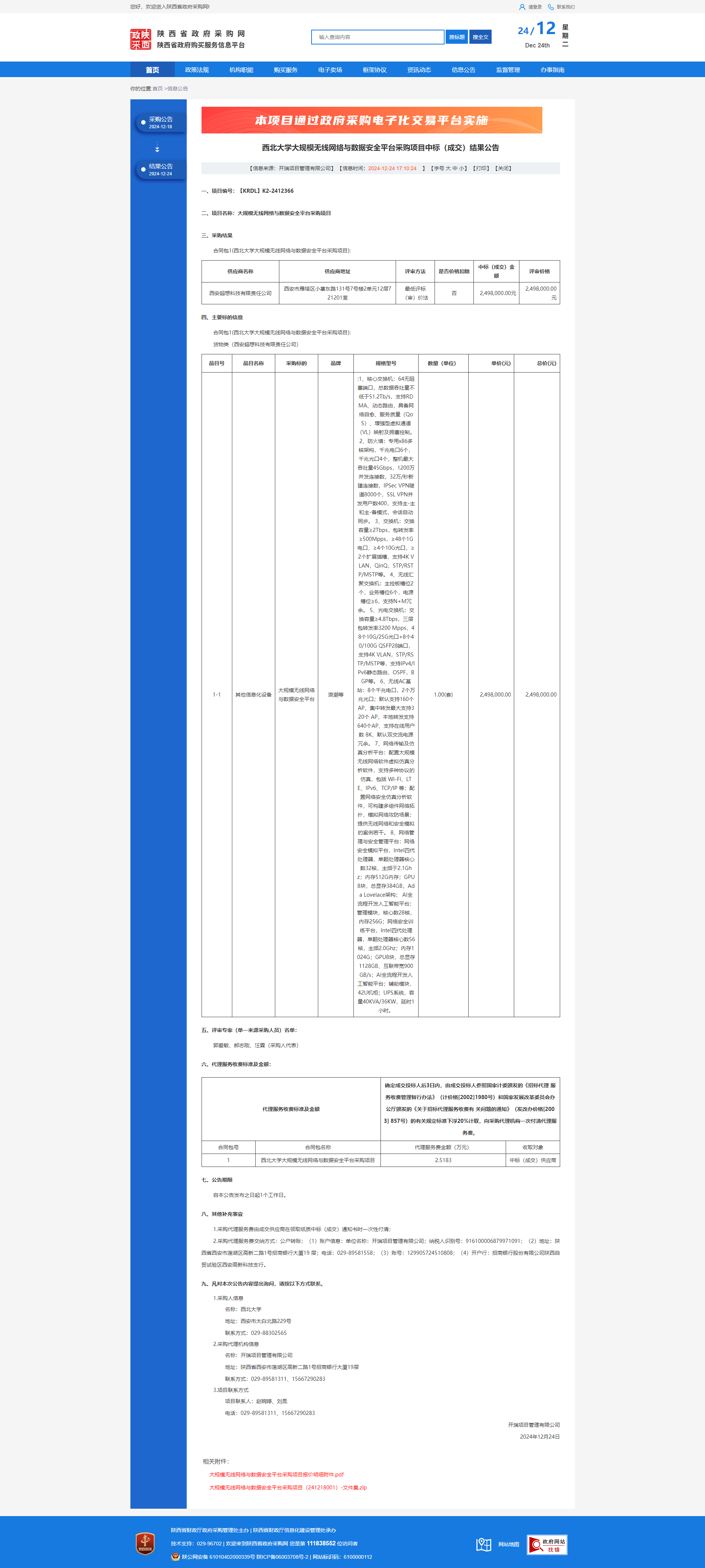 西北大学大规模无线网络与数据安全平台采购项目中标(成交)结果公告
