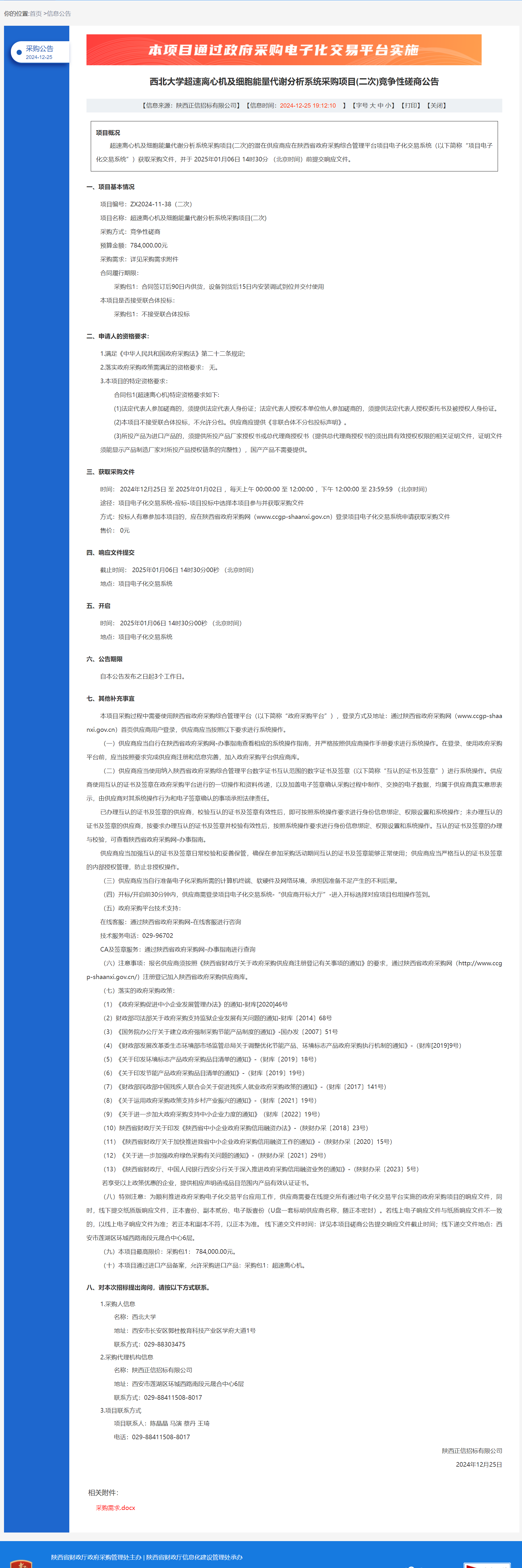 西北大学超速离心机及细胞能量代谢分析系统采购项目(二次)竞争性磋商公告 作者:采购与招标办公室 编辑: 时间:2024-12-25 原公告链接:https://www.ccgp-shaanxi.gov.cn/freecms/site/shaanxi/ggxx/info/2024/8a69c44e9218572b0193fd6e7f5f4622.html?noticeType=001016¬iceId=bb6eaae2-c2b2-11ef-8063-08c0eb20c666