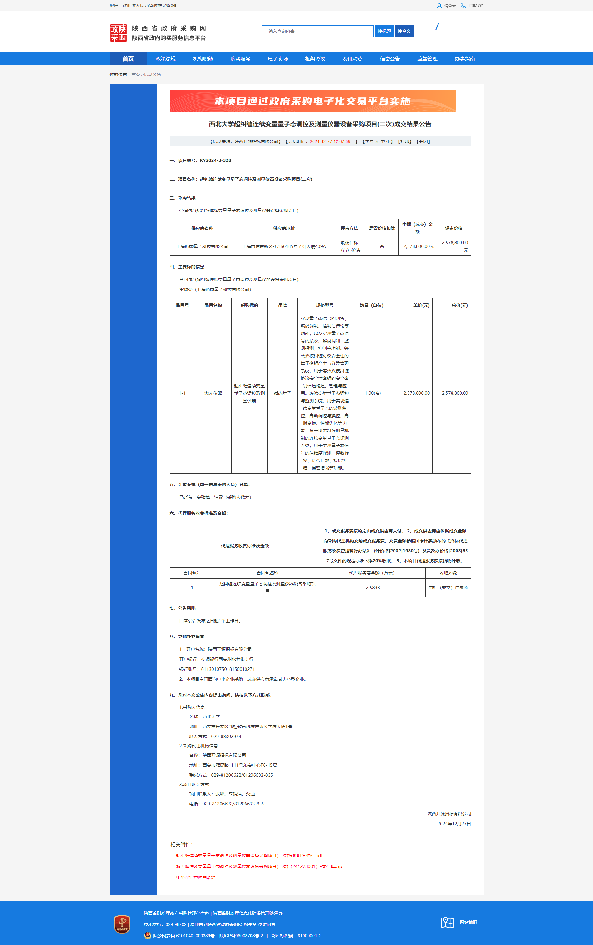 西北大学超纠缠连续变量量子态调控及测量仪器设备采购项目(二次)成交结果公告