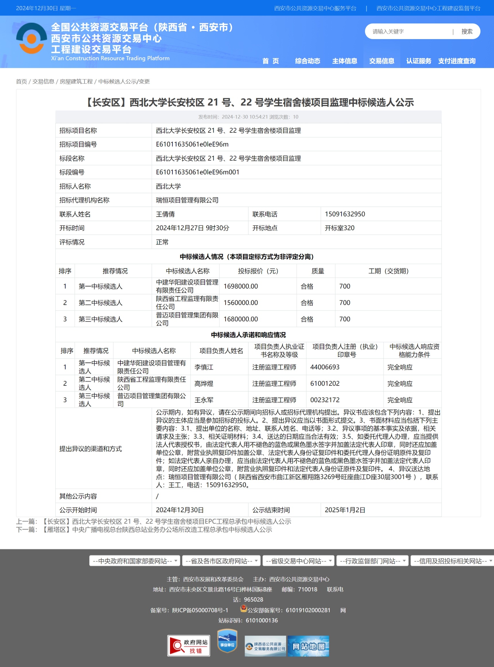 西北大学长安校区 21 号、22 号学生宿舍楼项目监理中标候选人公示