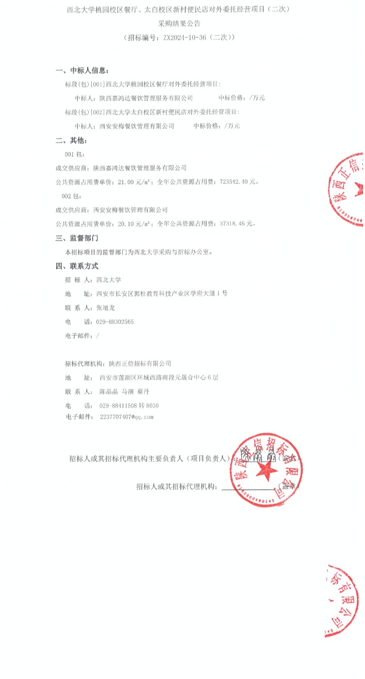 西北大学桃园校区餐厅、太白校区新村便民店对外委托经营项目(二次)采购结果公告