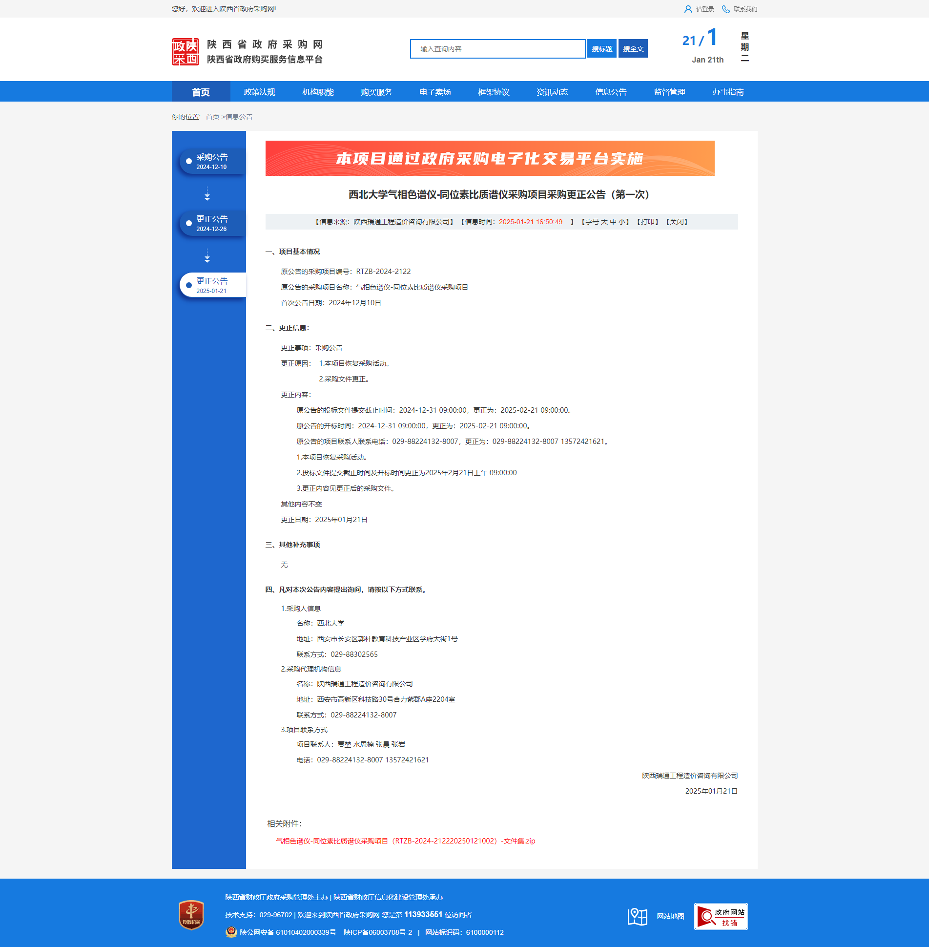 西北大学气相色谱仪-同位素比质谱仪采购项目采购更正公告(第一次)