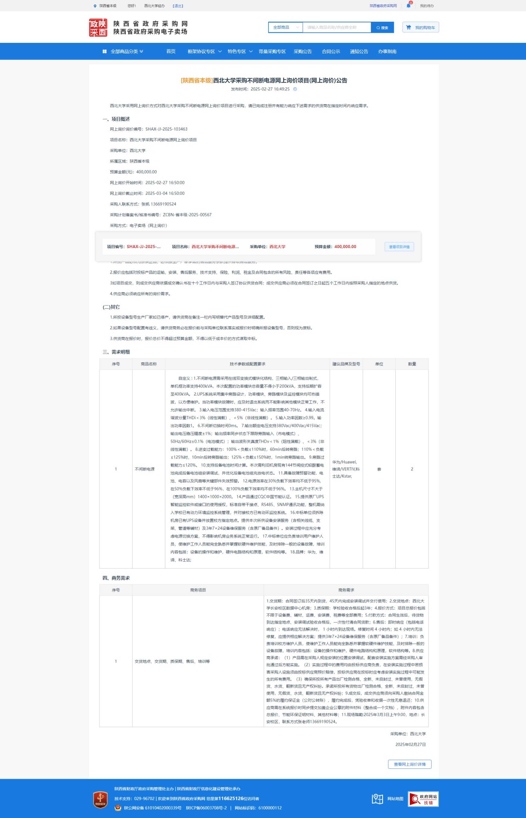 西北大学采购不间断电源网上询价项目(网上询价)公告