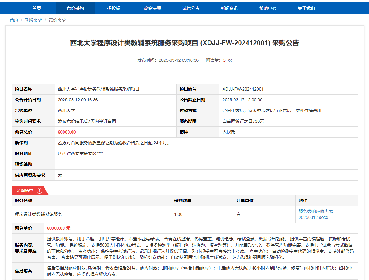 西北大学2025年04月至2025年07月政府采购意向