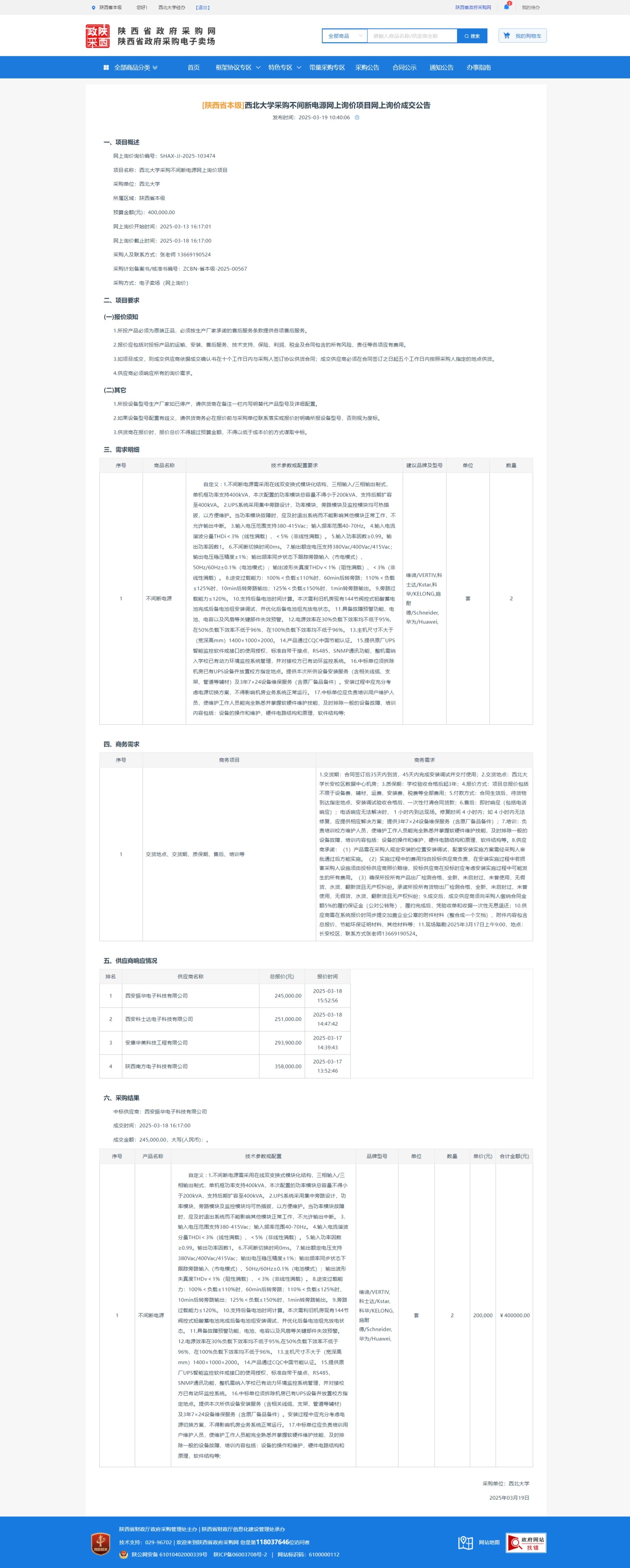 西北大学采购不间断电源网上询价项目网上询价成交公告 作者: 编辑:采购与招标办公室 时间:2025-03-19 原公告链接:https://www.ccgp-shaanxi.gov.cn/gpmall-main-web/basic/noticeDetail?noticeGuid=7301336059869331456