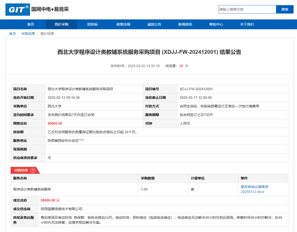 西北大学程序设计类教辅系统服务采购项目(XDJJ-FW-202412001)竞价结果公告 作者:采购与招标办公室 编辑: 时间:2025-03-20 原公告链接:https://www.ejingcai.com.cn/site/bidding/detail/17064