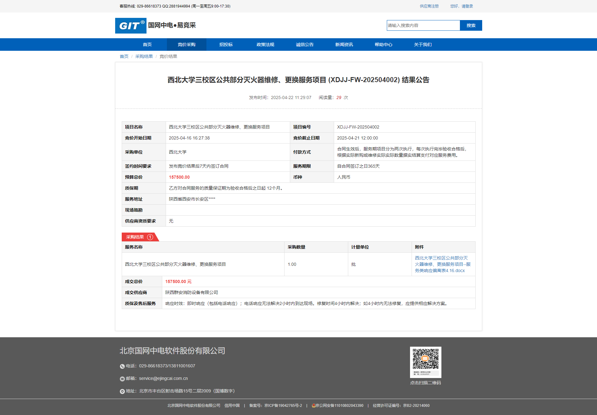 西北大学三校区公共部分灭火器维修、更换服务项目 (XDJJ-FW-202504002) 结果公告