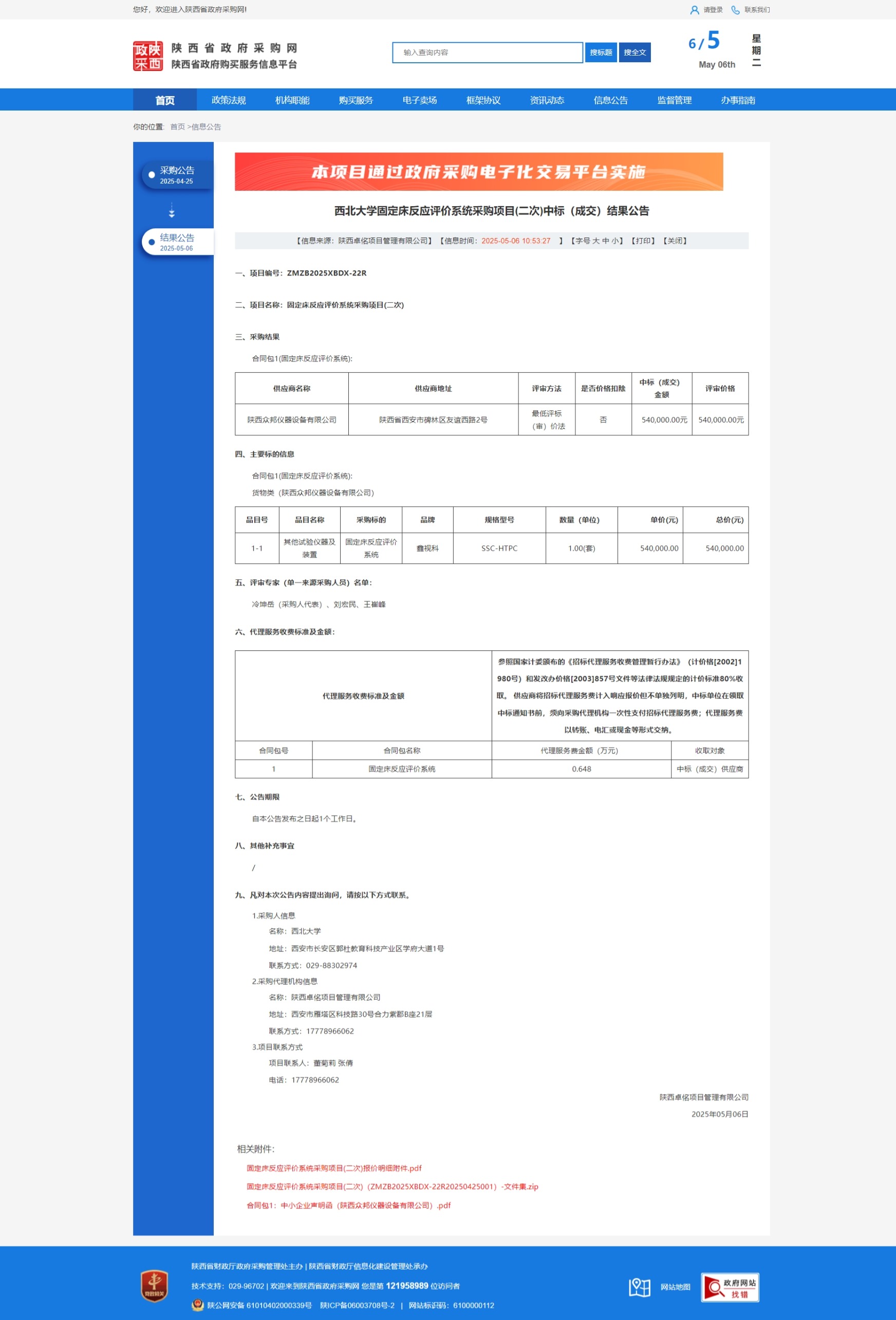 西北大学固定床反应评价系统采购项目(二次)中标(成交)结果公告 作者: 编辑:采购与招标办公室 时间:2025-05-06 原公告链接:https://www.ccgp-shaanxi.gov.cn/freecms/site/shaanxi/ggxx/info/2025/8a69c0a2967206000196a355be75555d.html?noticeType=001023¬iceId=2cacf8fa-2a27-11f0-8063-08c0eb20c666