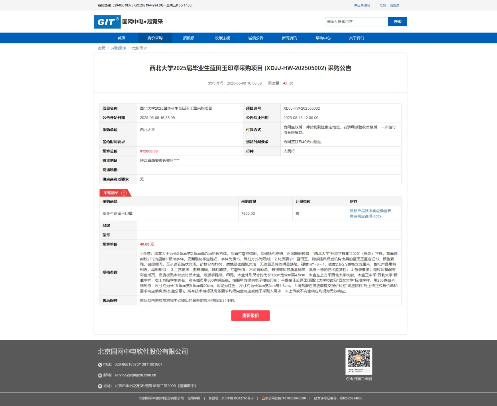 西北大学2025届毕业生蓝田玉印章采购项目 (XDJJ-HW-202505002) 竞价采购公告 作者: 编辑:采购与招标办公室 时间:2025-05-09 原公告链接:https://www.ejingcai.com.cn/site/bidding/detail/18114