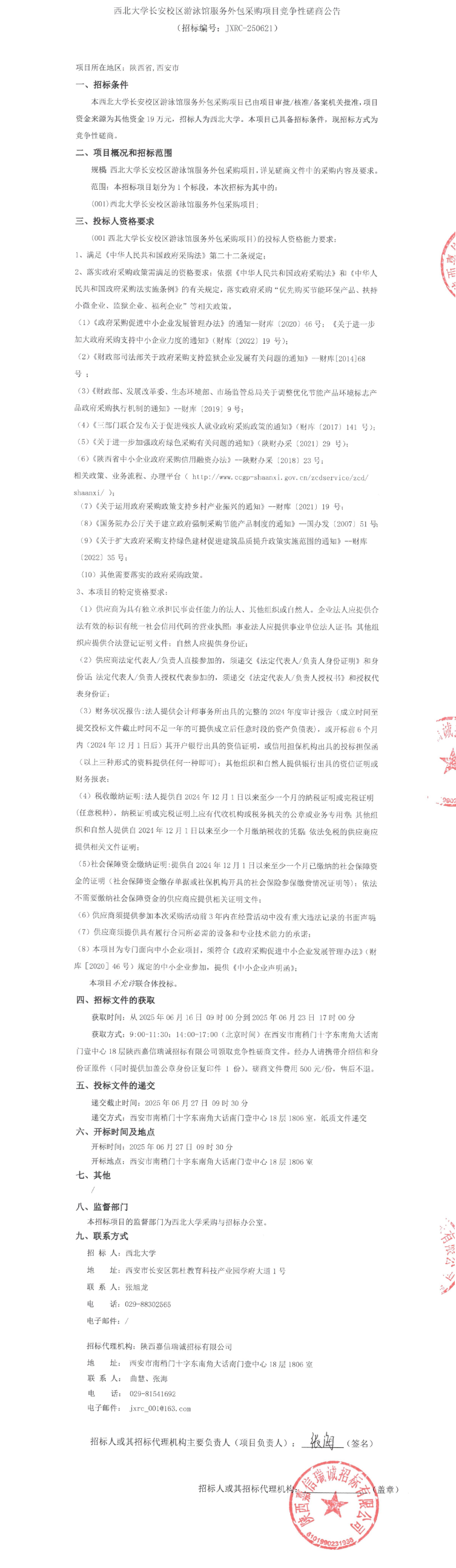 西北大学长安校区游泳馆服务外包采购项目竞争性磋商公告