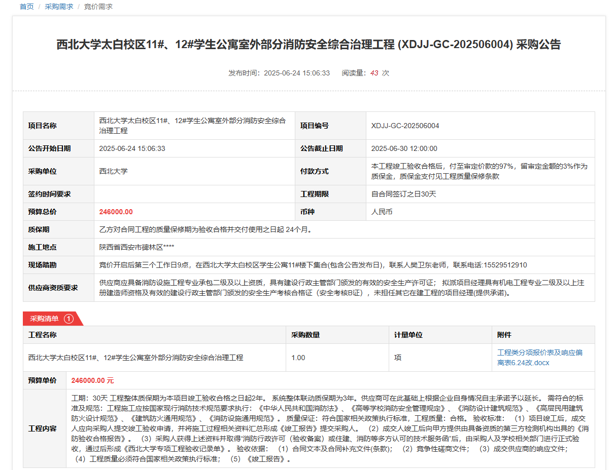 西北大学太白校区11#、12#学生公寓室外部分消防安全综合治理工程(XDJJ-GC-202506004)竞价采购公告