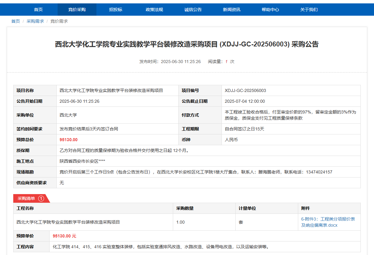 西北大学太白校区人脸识别门禁系统采购项目(XDJJ-HW-202506004)竞价结果公告