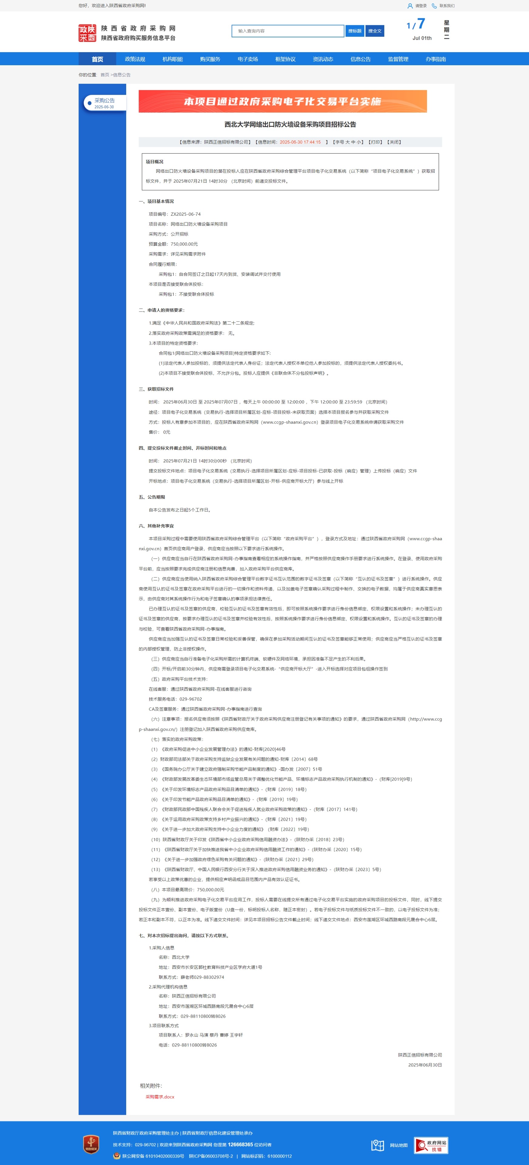 西北大学网络出口防火墙设备采购项目招标公告 作者: 编辑:采购与招标办公室 时间:2025-07-01 原公告链接:https://www.ccgp-shaanxi.gov.cn/freecms/site/shaanxi/ggxx/info/2025/8a69c2ef97af7dd30197c01b7ca54817.html?noticeType=001011¬iceId=c6225ff7-5598-11f0-8063-08c0eb20c666