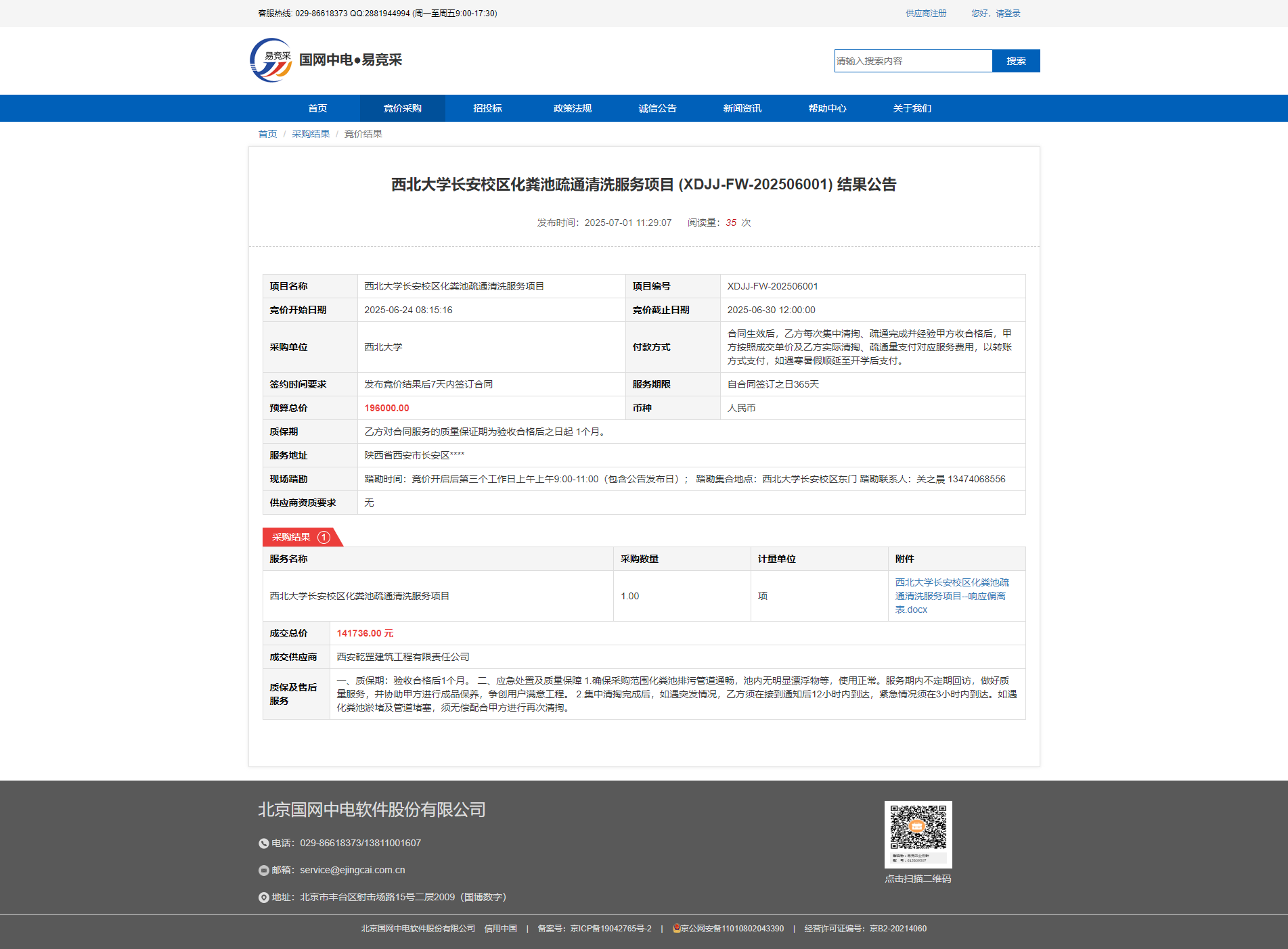 西北大学长安校区化粪池疏通清洗服务项目 (XDJJ-FW-202506001) 结果公告