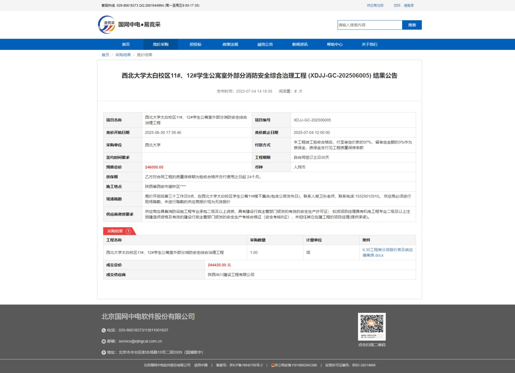 西北大学太白校区11#、12#学生公寓室外部分消防安全综合治理工程 (XDJJ-GC-202506005) 结果公告