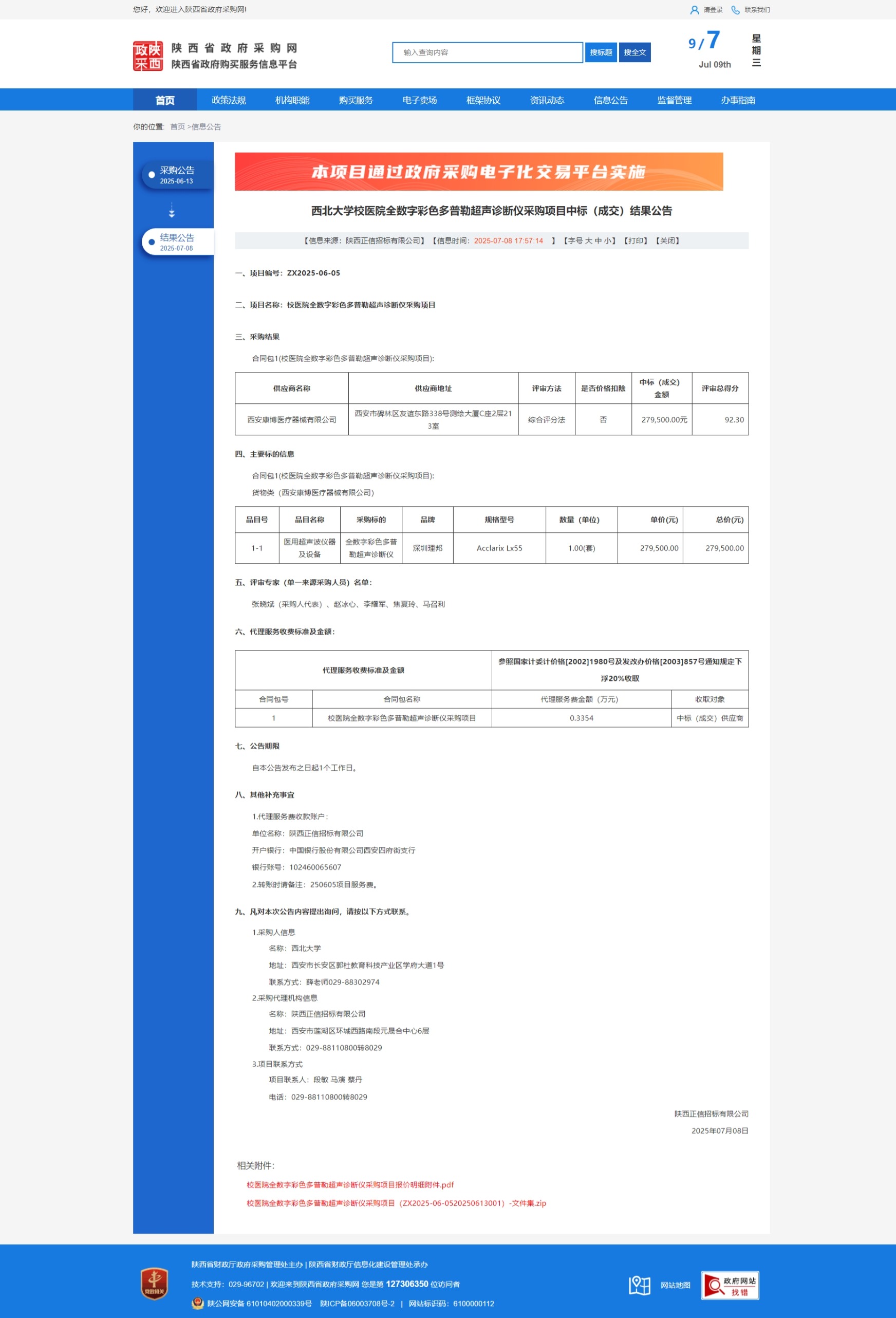 西北大学校医院全数字彩色多普勒超声诊断仪采购项目中标(成交)结果公告