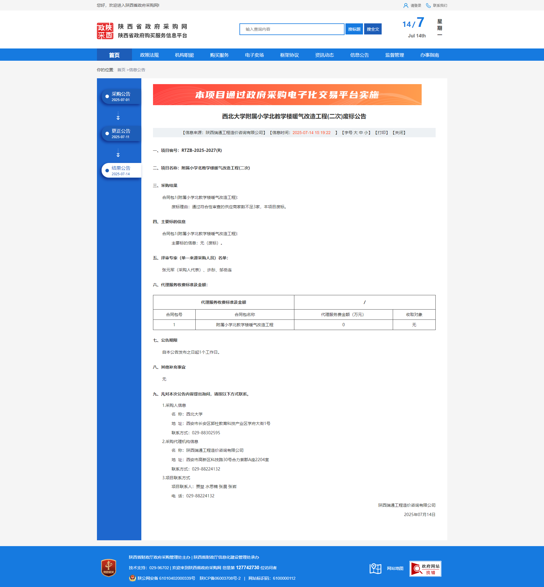 西北大学附属小学北教学楼暖气改造工程(二次)废标公告