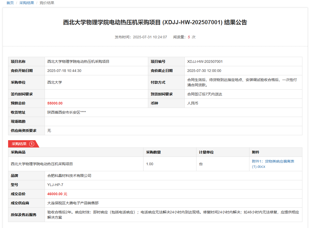 西北大学物理学院液相色谱仪采购项目(XDJJ-HW-202507002)竞价结果公告