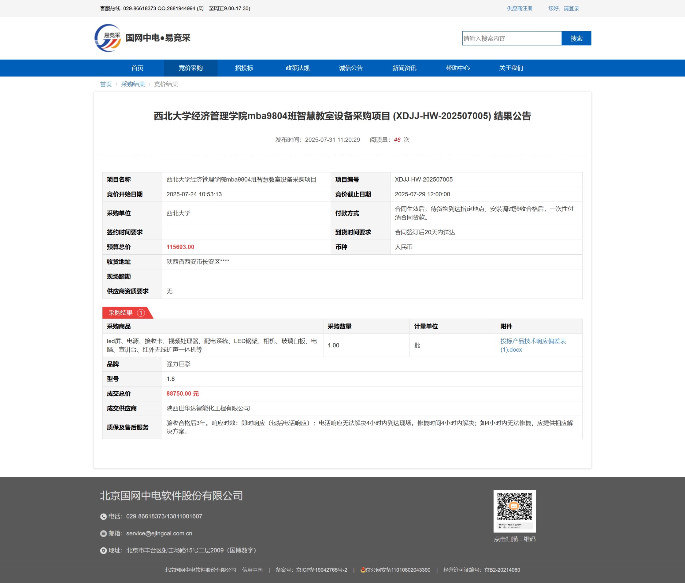 西北大学经济管理学院mba9804班智慧教室设备采购项目 (XDJJ-HW-202507005) 竞价结果公告 作者: 编辑:采购与招标办公室 时间:2025-07-31 原公告链接:https://www.ejingcai.com.cn/site/bidding/detail/19832