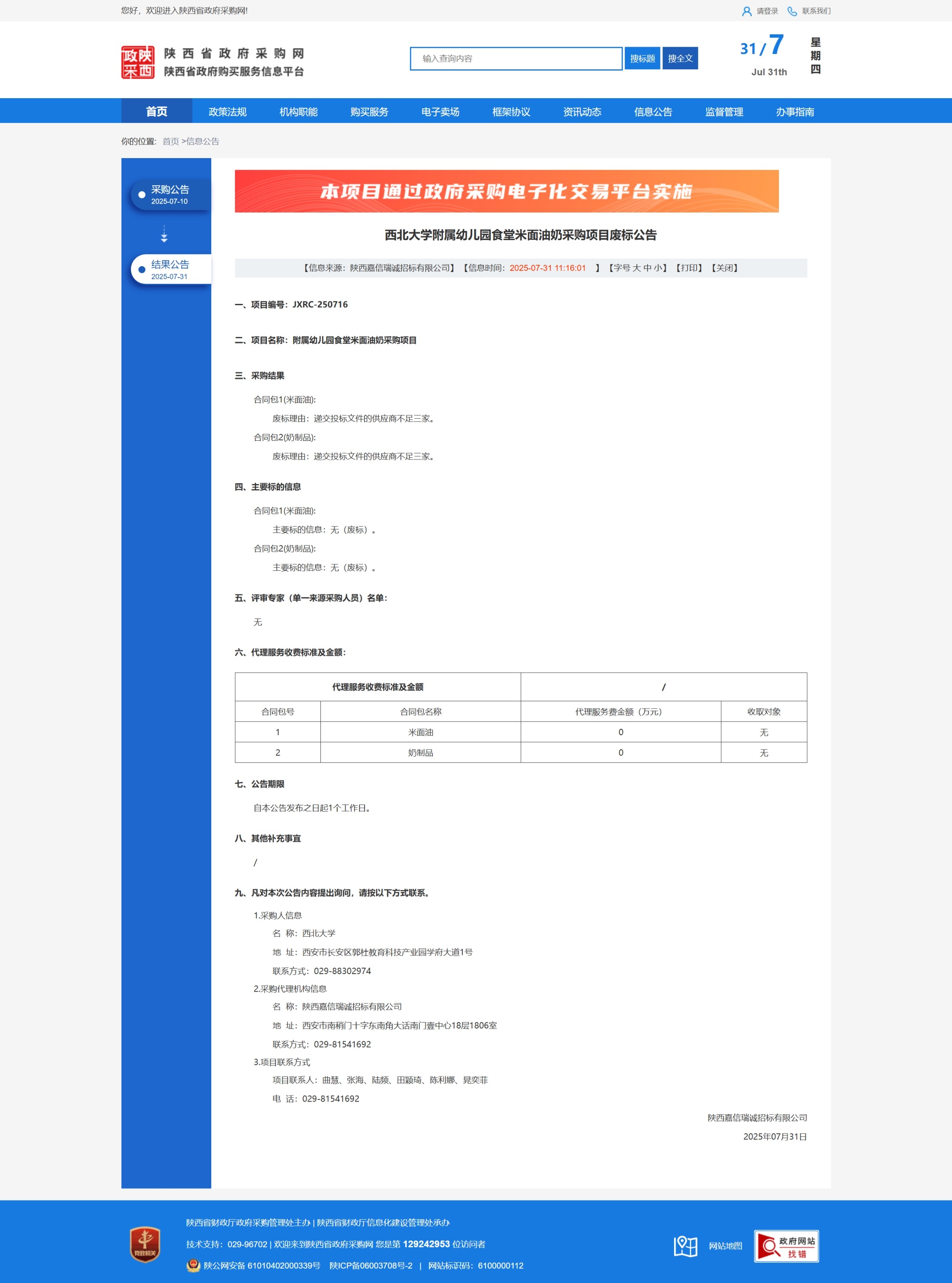 西北大学附属幼儿园食堂米面油奶采购项目废标公告 作者: 编辑:采购与招标办公室 时间:2025-07-31 原公告链接:https://www.ccgp-shaanxi.gov.cn/freecms/site/shaanxi/ggxx/info/2025/8a69c0c7985e48f501985e6d02b81fb9.html?noticeType=001006¬iceId=b9835470-6dbe-11f0-8063-08c0eb20c666
