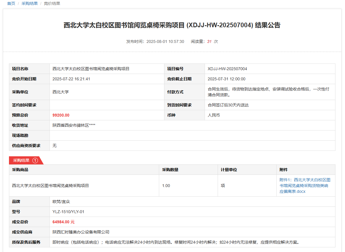 西北大学太白校区图书馆阅览桌椅采购项目(XDJJ-HW-202507004)竞价结果公告