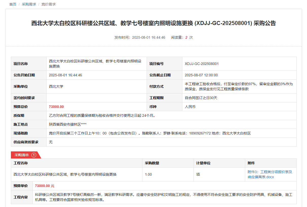 西北大学太白校区科研楼公共区域、教学七号楼室内照明设施更换(XDJJ-GC-202508001)竞价采购公告