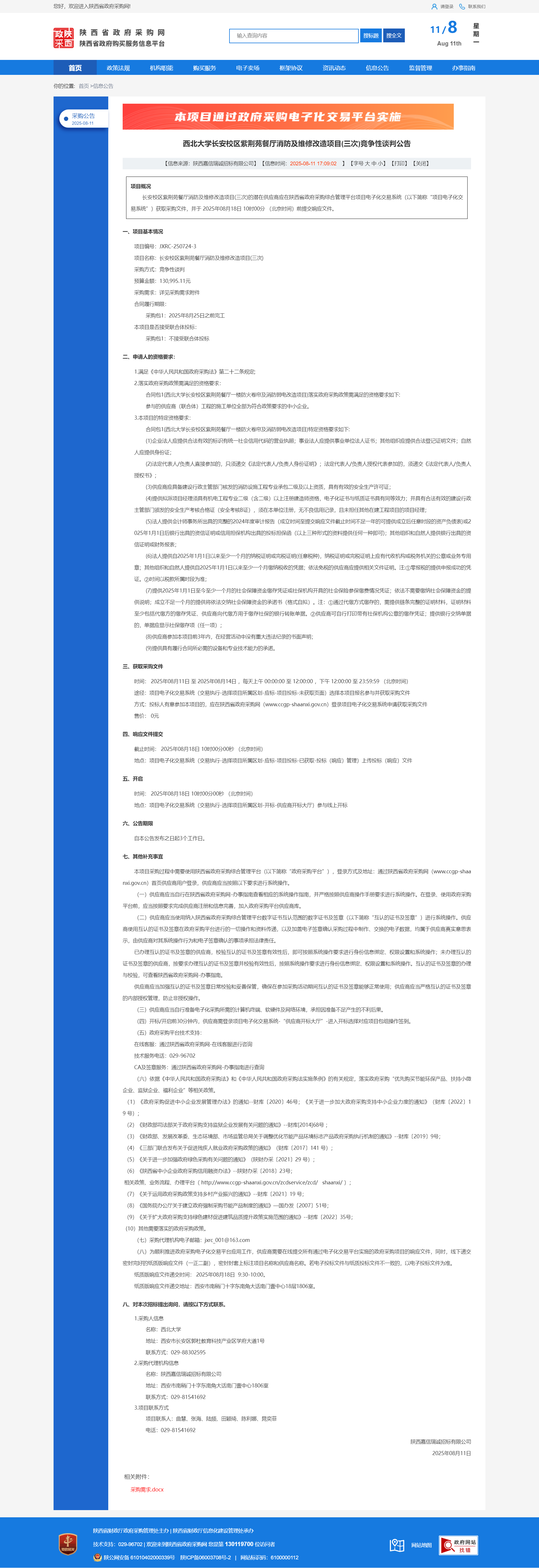 西北大学长安校区紫荆苑餐厅消防及维修改造项目(三次)竞争性谈判公告
