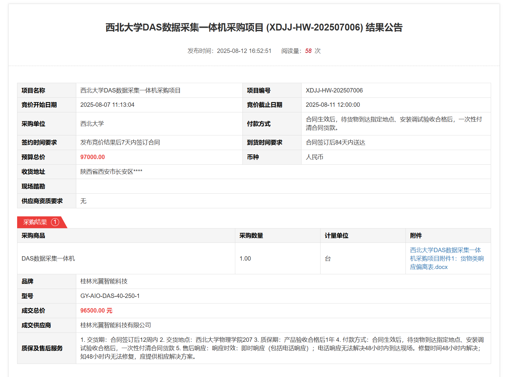 西北大学DAS数据采集一体机采购项目(XDJJ-HW-202507006)竞价结果公告