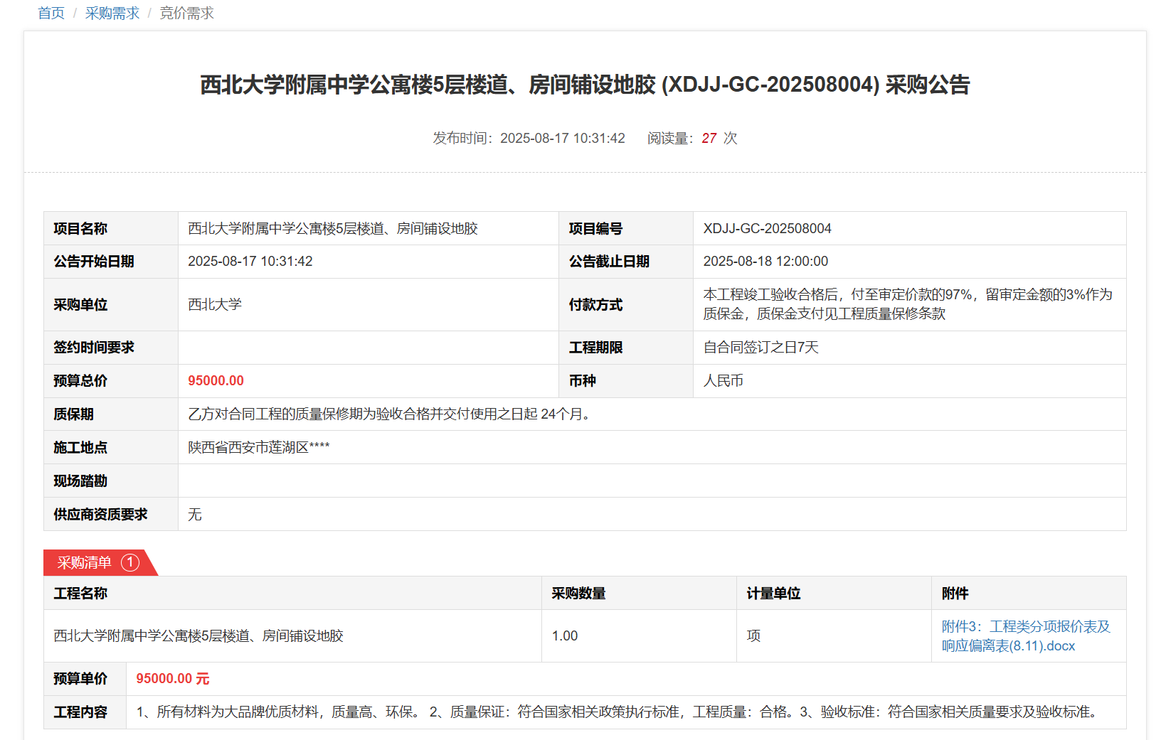 西北大学附属中学公寓楼5层楼道、房间铺设地胶(XDJJ-GC-202508004)竞价采购公告