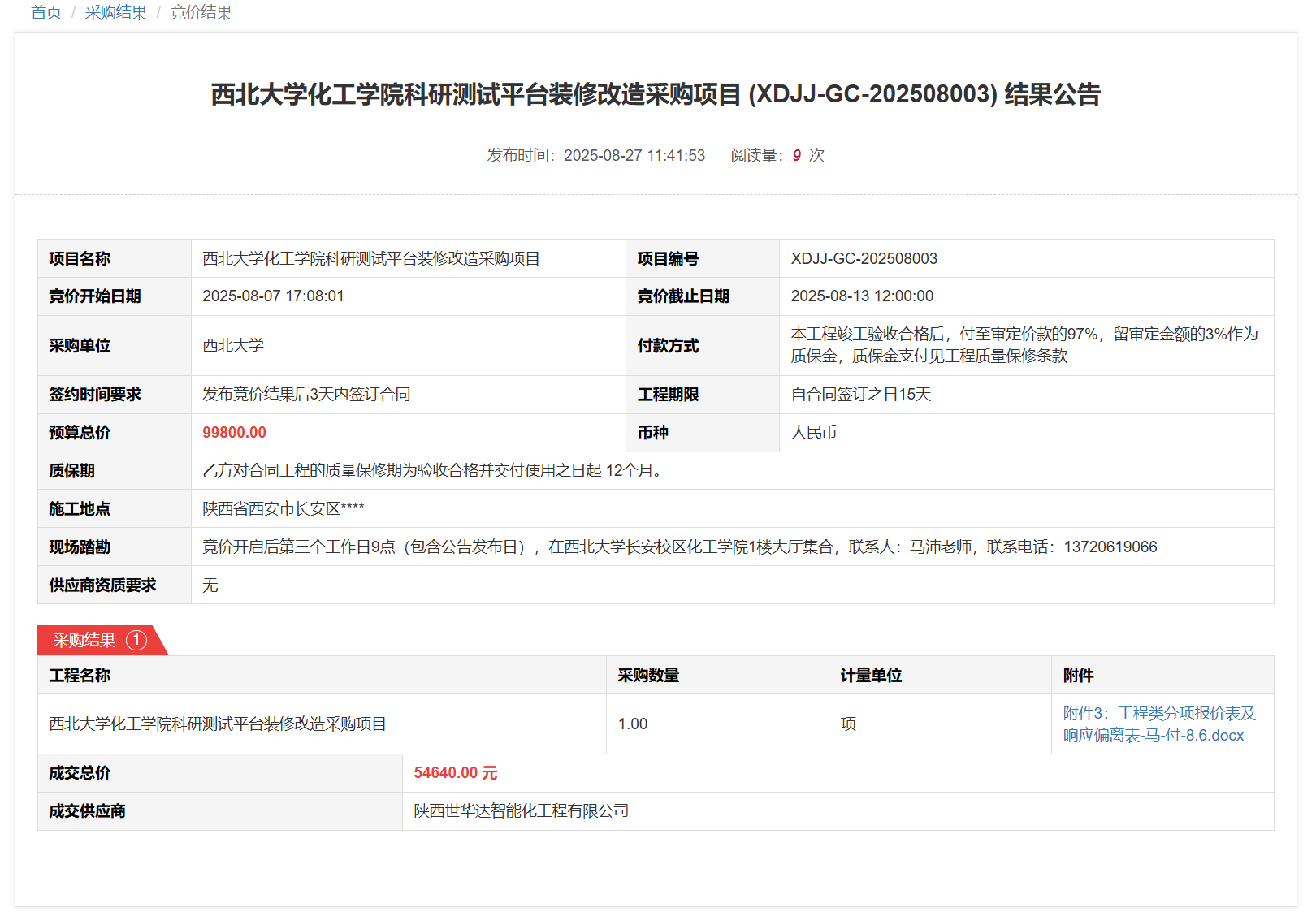 西北大学化工学院科研测试平台装修改造采购项目(XDJJ-GC-202508003)竞价结果公告