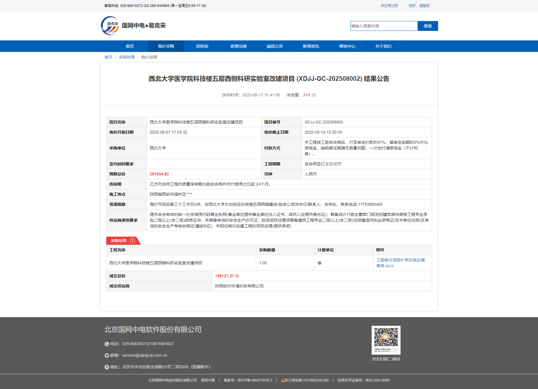 西北大学太白校区科研楼公共区域、教学七号楼室内照明设施更换(XDJJ-GC-202508001)竞价结果公告