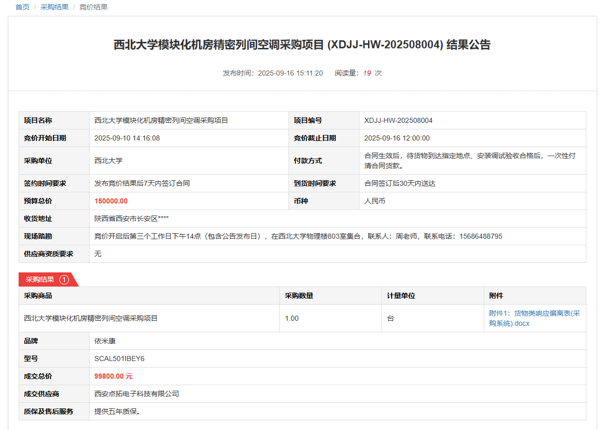 西北大学模块化机房精密列间空调采购项目(XDJJ-HW-202508004)竞价结果公告