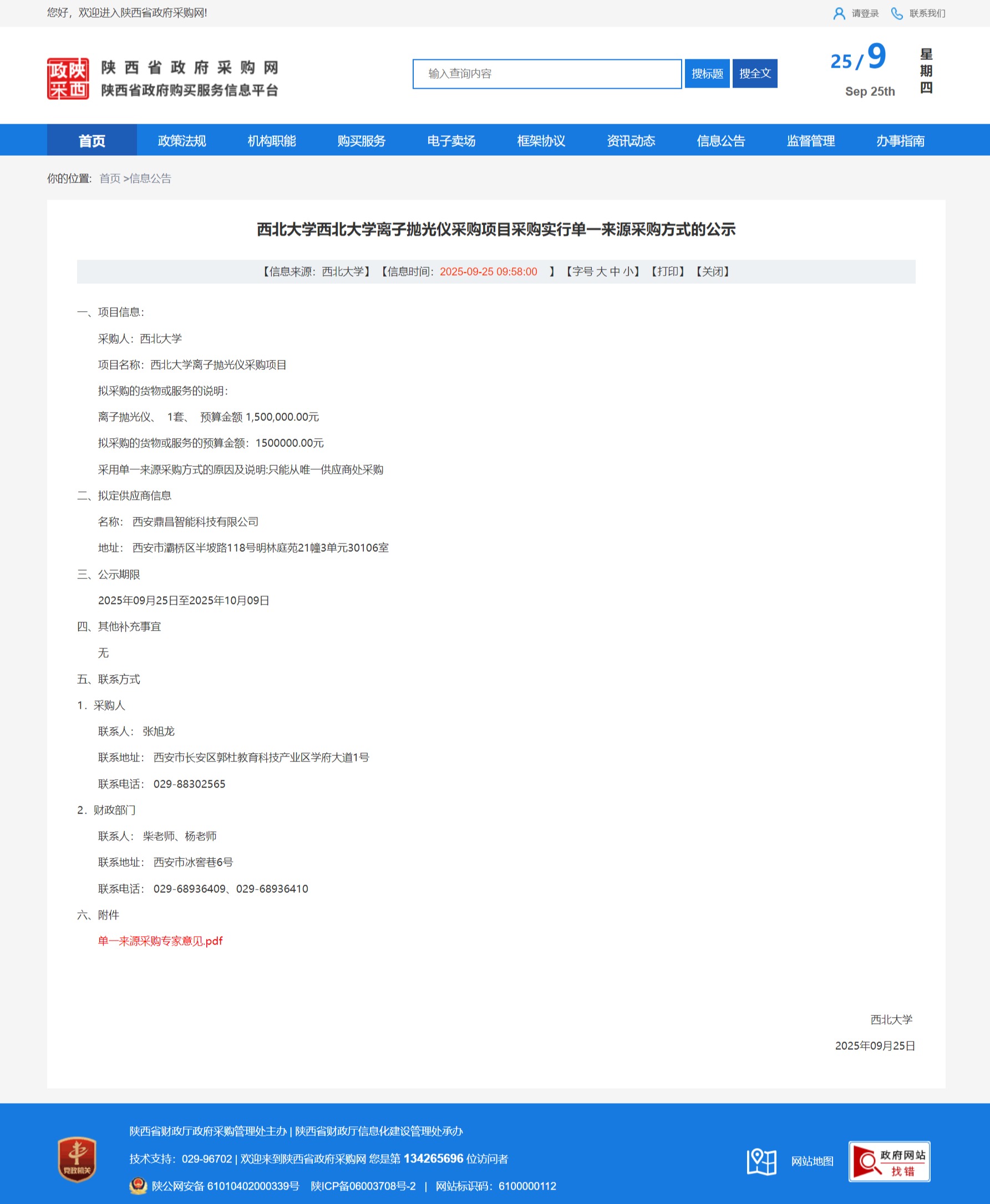 西北大学离子抛光仪采购项目实行单一来源采购方式的公示