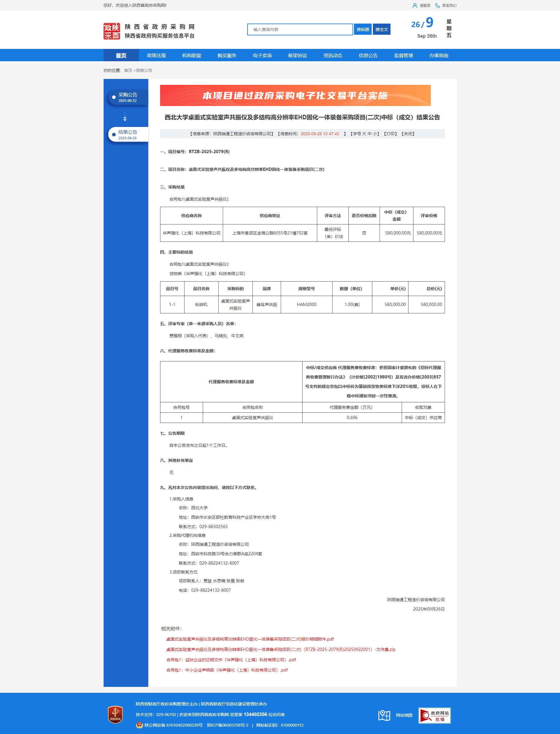 西北大学桌面式实验室声共振仪及多结构高分辨率EHD固化一体装备采购项目(二次)中标(成交)结果公告