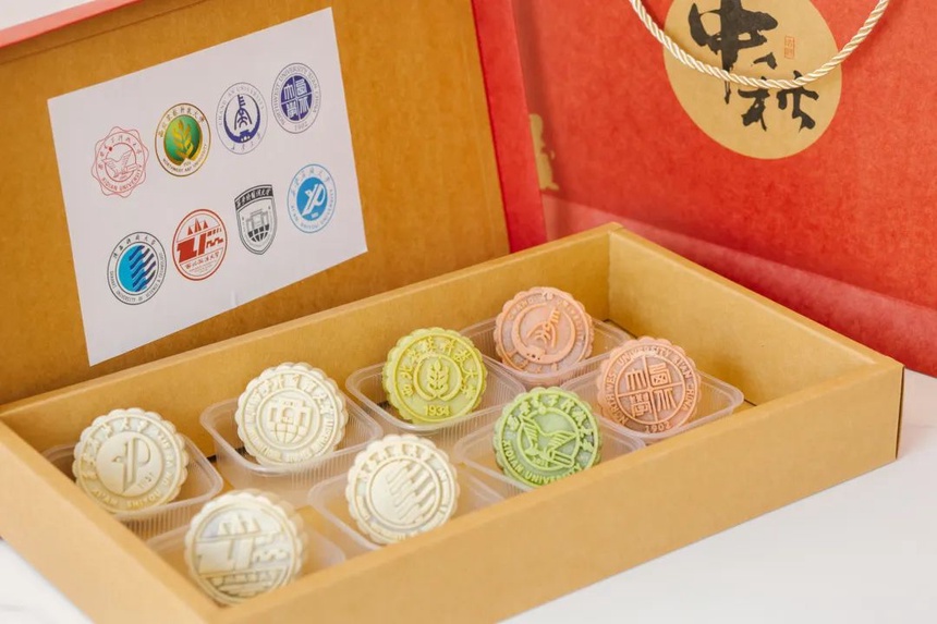 朱红色的包装满溢着火热的祝福,盒内放置着八块月饼,分别拓印着八所高校的校徽图案。每一块,都浓缩着每个高校的满满心意。松软的桃山饼皮包裹着香甜的内馅,更有抹茶红豆、樱花黑芝麻、牛奶莲蓉,三种特色口味一次满足味蕾!