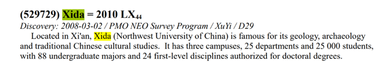 国际永久编号为529729号的小行星以西北大学命名,称为“Xida”星。(来源 西北大学)
