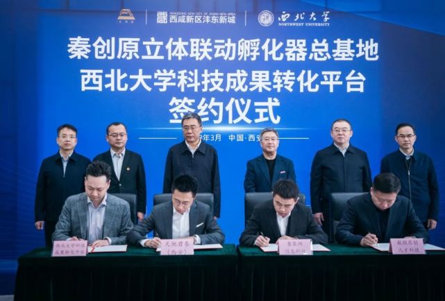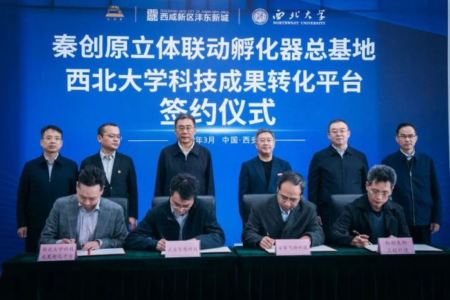 3月3日上午,西北大学科技成果转化平台签约仪式在西咸新区沣东新城秦创原立体联动孵化器总基地举行。西咸新区党工委委员、沣东新城党委书记、管委会主任姚海军,西咸新区科技创新和新经济局局长王斌,沣东新城党委委员、管委会副主任蒋波,西北大学校长郭立宏,校党委常委、副校长常江,西咸新区秦创原创新促进中心相关负责人及学校相关单位负责人、教师代表出席仪式。