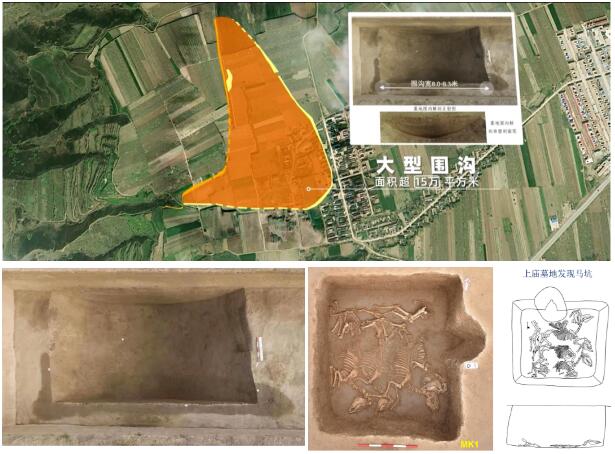 围沟墓地位置(上)、解剖正射图(左下)和马坑(右下)。