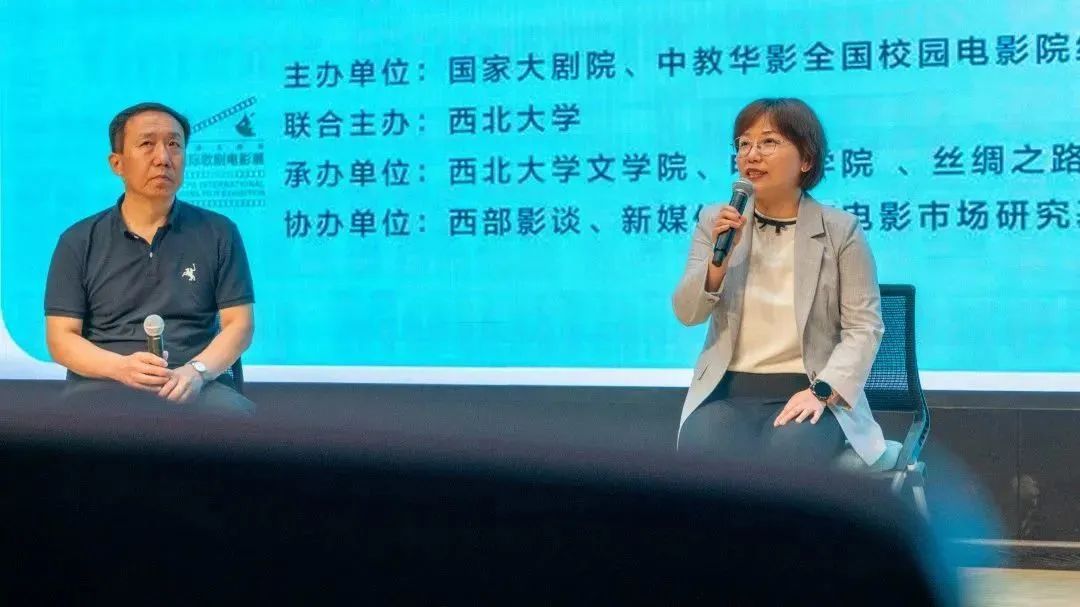 展映活动后,国家大剧院嘉宾与西北大学文学院领导、戏剧影视专业教师展开合作交流座谈。座谈会上,文学院党委副书记陈柯老师向国家大剧院嘉宾介绍了西北大学黑美人艺术节的发展历程,高字民老师分享了西北大学的校园戏剧创作、戏剧美育及美育思政等方面的相关成果,张也奇老师和殷大惟老师介绍了戏剧影视专业同学在影视拍摄制作、戏剧影视评论、新媒体运营等方面的专业技能优势。国家大剧院市场部金慧部长介绍了国家大剧院面向高校在剧场资源、人才培养、公益展演展映方面的相关合作情况,国家大剧院影视节目制作部一级高级主管杜磊老师介绍了舞台艺术作品影视制作、戏剧新媒体传播方面的创新成果。双方就师生专业实习实践、校园戏剧创作、表演专业建设等方面展开交流,表达了良好的合作意愿。