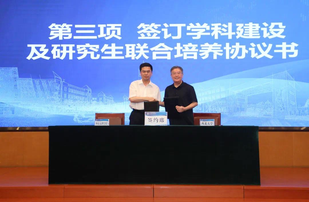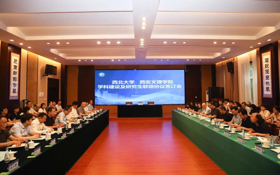 西北大学与西安文理学院签署学科建设与硕士研究生联合培养协议 作者: 编辑:张邓斓 时间:2023-06-19 6月15日下午,西北大学与西安文理学院签署学科建设与硕士研究生联合培养协议。西北大学校长郭立宏,校党委常委、副校长赖绍聪,西安文理学院党委书记王育选,校长陈刚,党委委员、副校长刘明利出席仪式,两校相关职能部门及院系负责人参加。 两校签署合作协议旨在协同发展中推进共建,在互动合作中实现共赢,在优势互补中强化共享,全力打造校校合作新典范;提质增效,各发所长,实现共赢。 郭立宏、陈刚代表双方签署合作协议。 根据协议内容,双方将围绕学科建设、学科管理、学位点建设、研究生联合培养、导师队伍建设等方面开展交流合作。 郭立宏表示,西北大学和西安文理学院作为陕西省属高校和西安市属高校中的“排头兵”,要主动作为、改革创新、加强合作,打破发展壁垒,凝聚发展合力,最大限度激发两校内驱活力、提升办学成效,更好地服务陕西和西安的地方经济社会建设。 王育选表示,西安文理学院将铆足干劲、狠抓落实,承接并落实好各项合作内容,共同推动两校高质量发展再创佳绩。 仪式前,西北大学一行还参观了西安文理学院校史馆、文物与博物馆学实验中心。 原文链接:https://xzzsx.sxdaily.com.cn/app/template/displayTemplate/news/newsDetail/5564/10226399.html?isShare=true