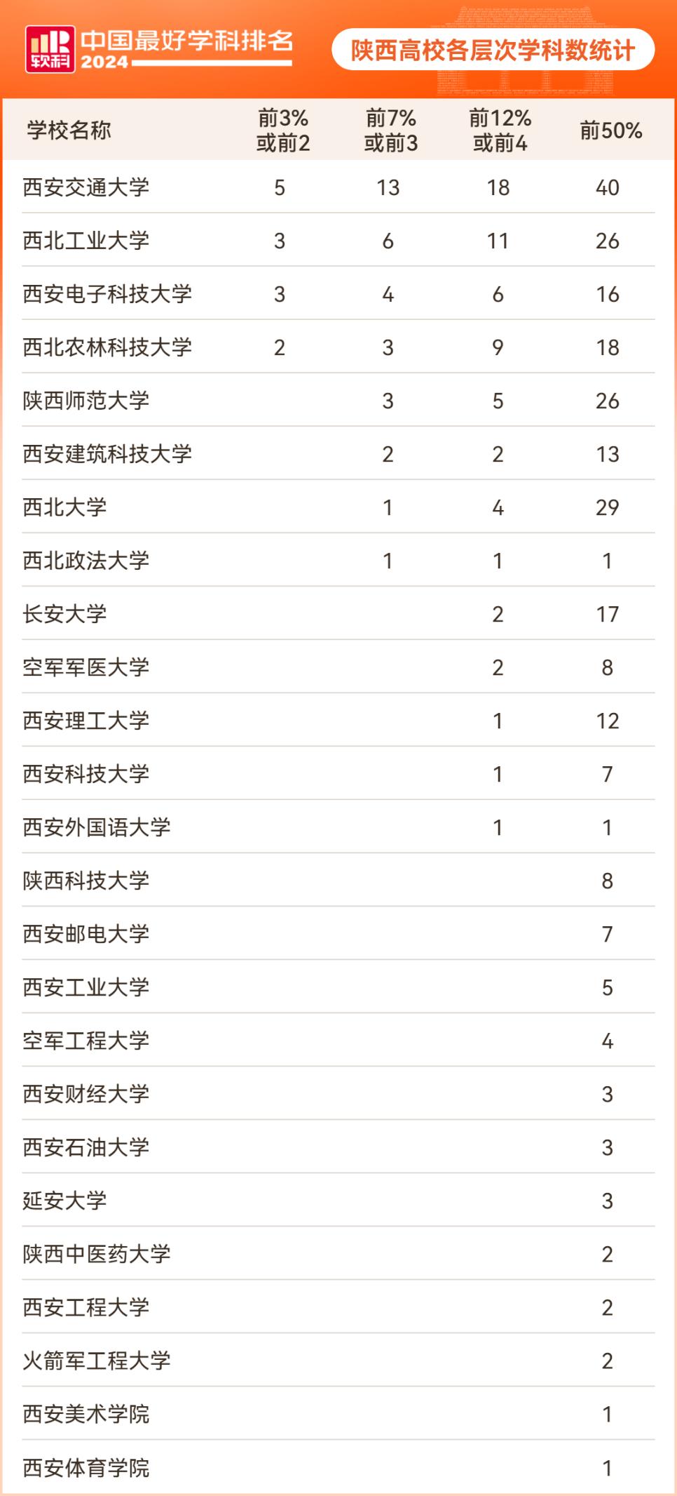 从陕西各高校上榜学科数来看,西安交通大学上榜学科数达40个,领跑全省;西北大学有29个学科上榜,上榜学科数位居省内第二;西北工业大学和陕西师范大学,均有26个学科上榜。上榜学科数超过10个的陕西高校还有西北农林科技大学(18个)、长安大学(17个)、西安电子科技大学(16个)、西安建筑科技大学(13个)、西安理工大学(12个)。