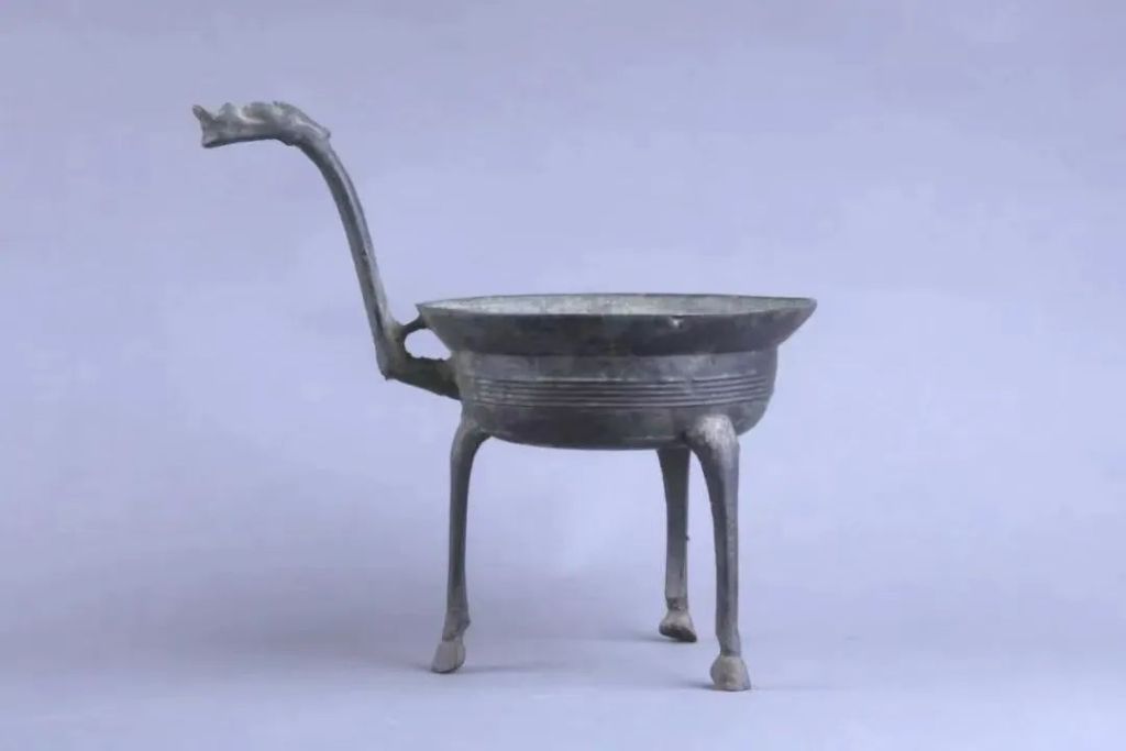 西北大学博物馆所收藏的这件铜鐎斗的器身为圆口深腹,形如小盆。一侧有一龙形柄,另一侧有上翘的流。下有较长的马蹄形足三个,腹下空间用于烧火加热。整个鐎斗造型犹如一只昂首挺胸的猛兽,雄浑威猛。