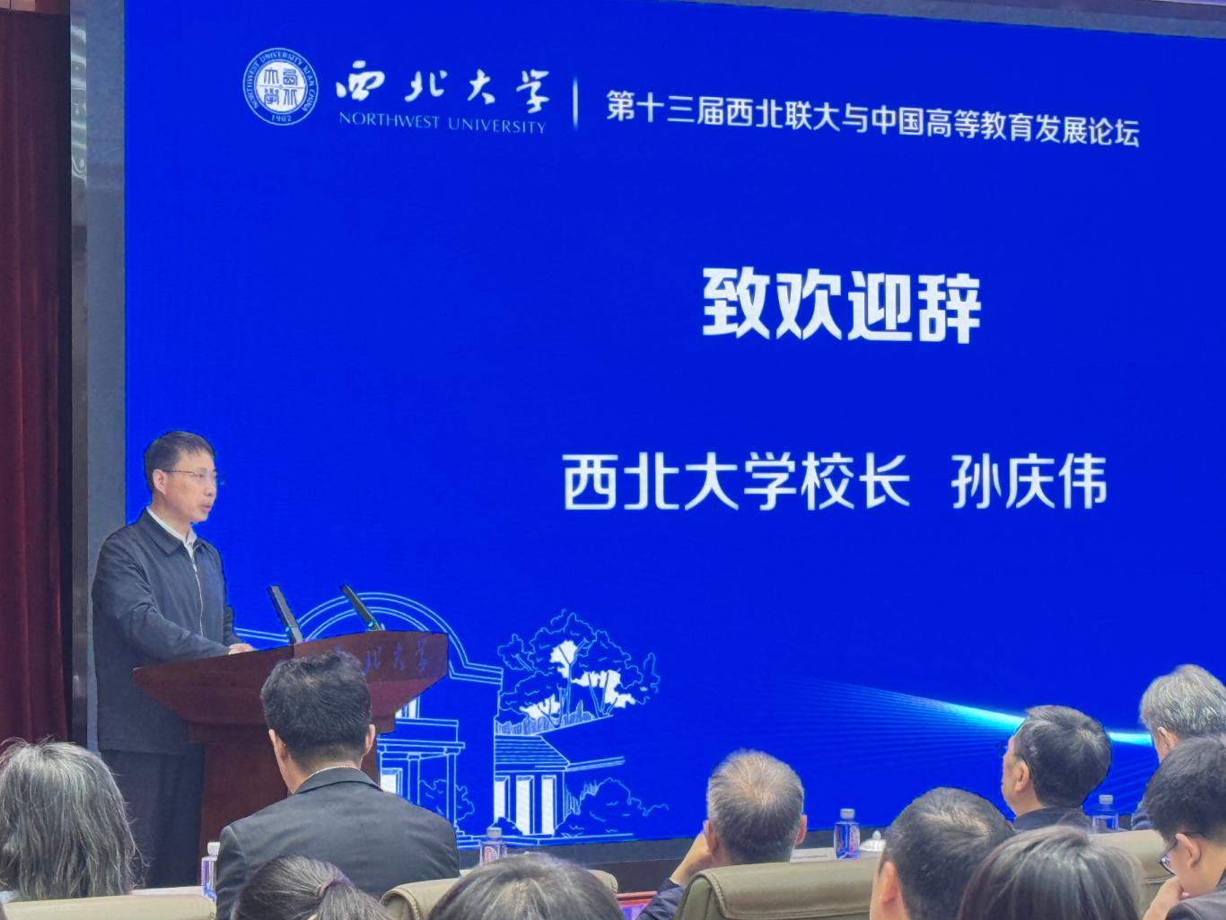 开幕式上,孙庆伟代表学校向与会专家学者和来宾表示欢迎。他简要介绍了西北联大的历史,以及西北大学近年来研究和宣传西北联大的重要成果。他指出,西北联大的组建,为当时的西北地区注入了科学元素,实现了世界近现代文化与中华优秀传统文化在西北地区的历史性对接与融汇。西北大学作为西北联大文化遗产的继承者之一,在“双一流”建设方面取得了长足进展。他强调,回顾西北联大光辉成就,深入发掘西北联大的历史底蕴和精神内涵,就是为了以史鉴今、总结经验,坚守初心、开创未来。西北大学将与兄弟高校进一步加强交流合作,共同探索新时代推动事业高质量发展的新理念、新路径,为强国建设、民族复兴伟业作出新的更大贡献。
