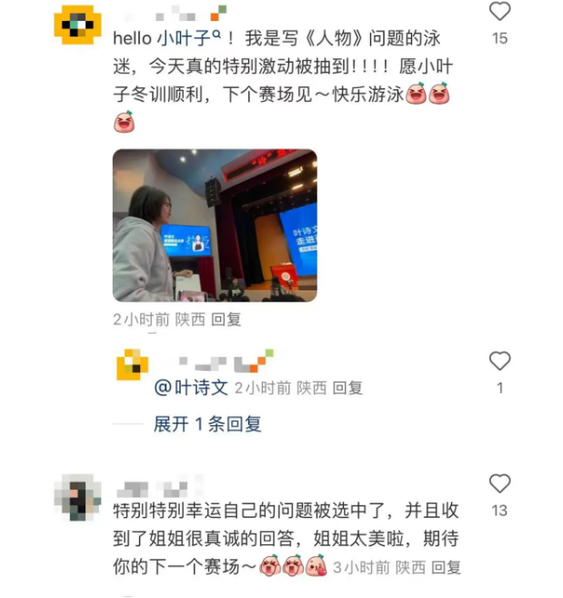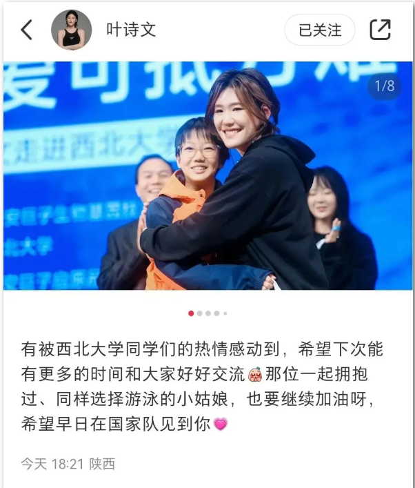 叶诗文随后在自己的社交账号发文称:“有被西北大学同学们的热情感动到,希望下次能有更多的时间和大家好好交流。”
