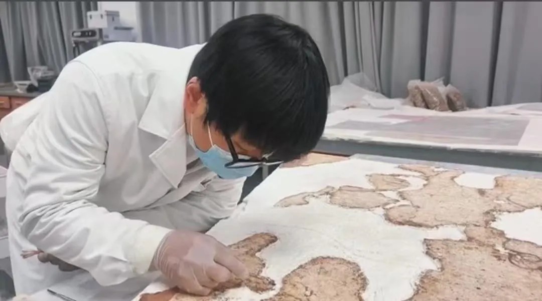 他的手微微颤动,但动作精准而稳定,刀刃距离脆弱颜料仅0.03毫米。他用耐心与技艺,赋予残破壁画新的生命,让千年故事得以延续。