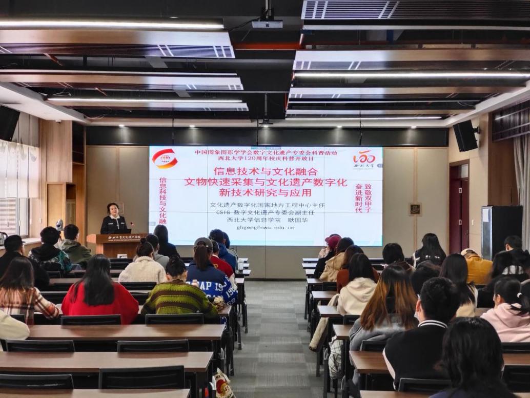 2022年11月12日,值西北大学120周年校庆之际,团队与西北大学文化遗产学院共同开展了“走近文化遗产数字化”校庆科普开放日专题科普活动。在文化遗产学院展出了第三代文物扫描仪、文物增强现实智能展示设备以及破损文物虚拟修复系统,并开放了秦腔全息智媒融合交互舞台以及碗幕立体展演交互设备。团队负责人耿国华教授为文化遗产学院二年级本科生带来了题为《信息技术与文化融合—文物快速采集与文化遗产数字化新技术研究与应用》的科普讲座,介绍了工程中心多年来在文物快速采集建模、破损文物虚拟修复、古人面貌虚拟复原以及文化遗产展示传播等领域的科研成果。