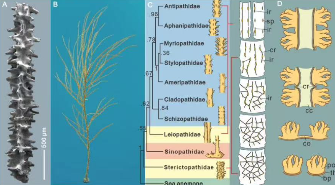 作为黑珊瑚目唯一的化石科,中华黑珊瑚科仅在我国湖北早奥陶世地层被发现。由于表面特征与现生黑珊瑚的差异巨大,其是否能够归属为黑珊瑚目,一直存在较大争议。“通过高分辨率显微CT技术,我们首次完整重建了黑珊瑚化石的三维内部结构,为确认其分类地位提供了关键证据。”西北大学博士生郝文静介绍,新发现的2个中奥陶世的黑珊瑚化石种,在演化上属于早奥陶世黑珊瑚化石与现代黑珊瑚之间的过渡形态类型,确认了硬黑珊瑚科属于黑珊瑚目。